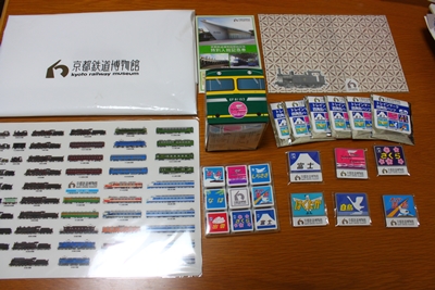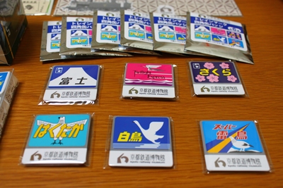 トレインマーク柄のチロルチョコ、トレインマークの四角缶バッチ。