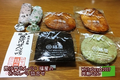 福おかき、毘沙門せんべい(無地、海苔、砂糖)です。